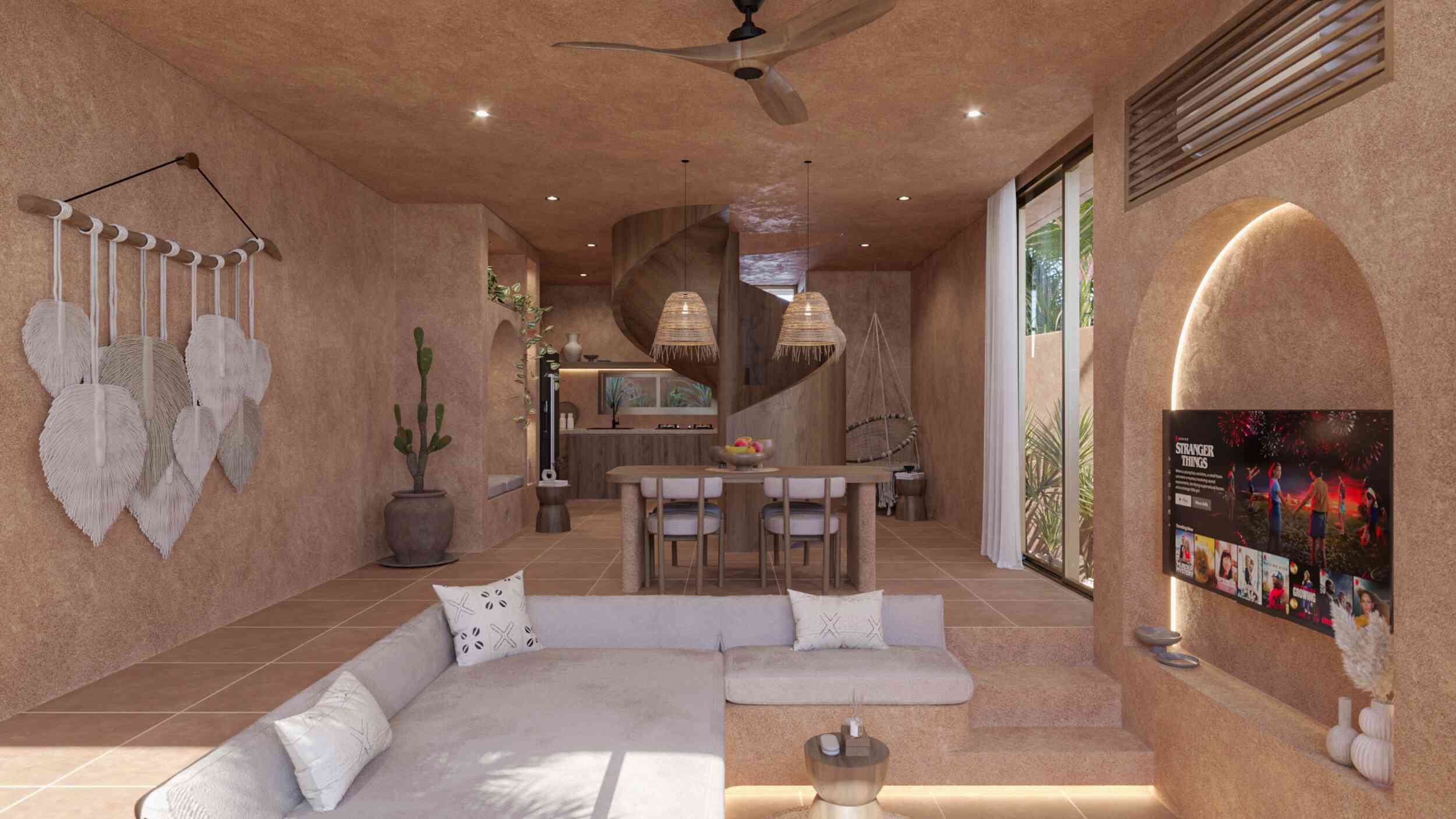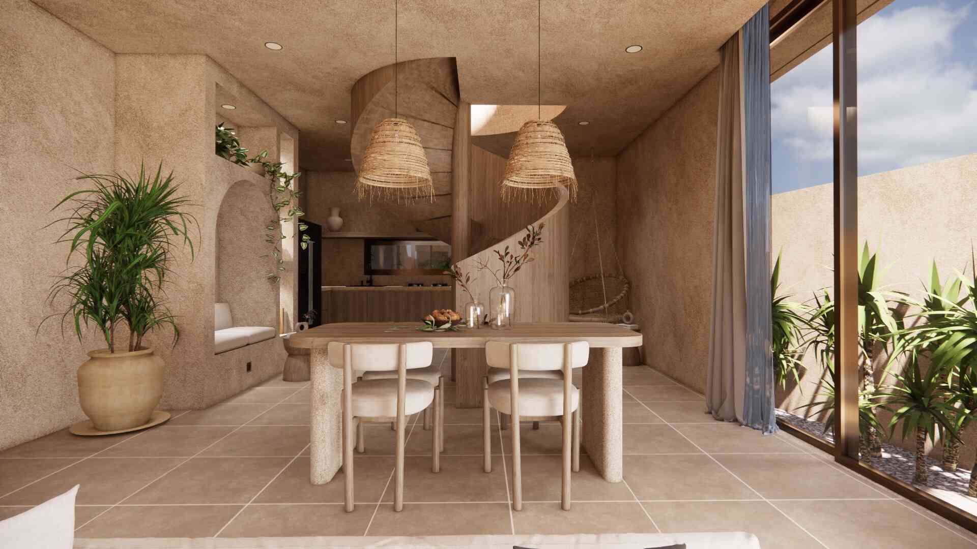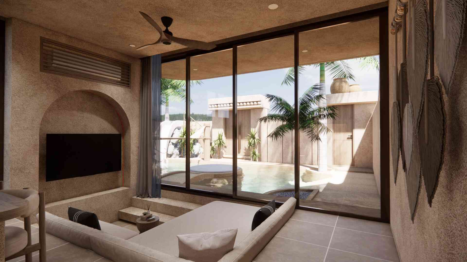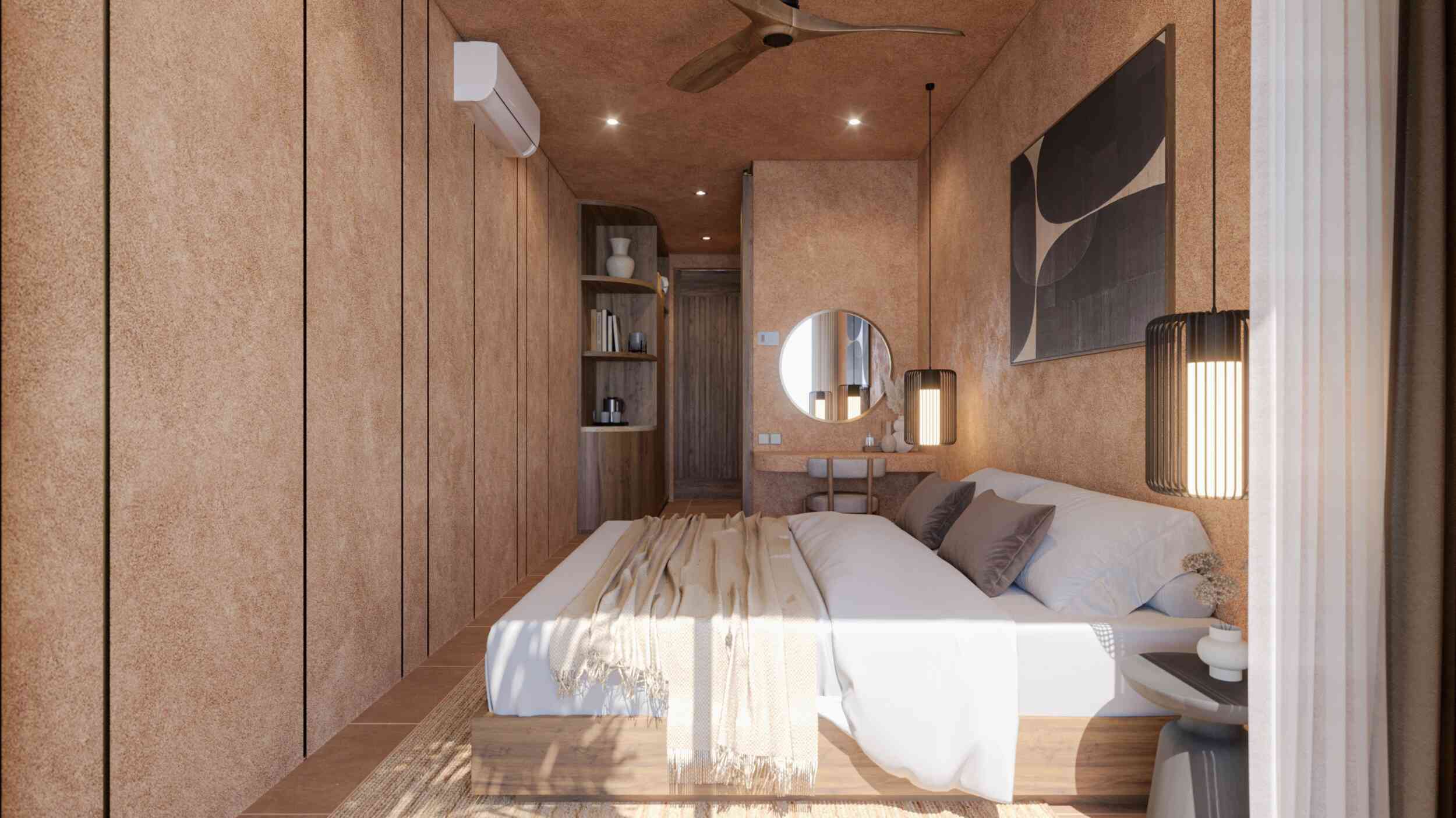 Inside, the villa offers a functional two-bedroom layout with a modern design, clean finishes, and a bright living space. The flow between indoor and outdoor areas works well for both personal use and daily rentals. The project takes inspiration from boutique resort-style architecture, blending warm materials with a contemporary look.