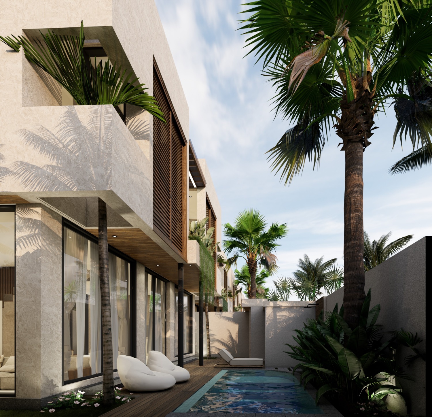 Designed with natural textures, soft neutral tones, and floor-to-ceiling glass, the villa offers seamless indoor-outdoor living. Featuring a private pool surrounded by wooden decking, lush landscaping, and a spacious enclosed living space, it’s a perfect retreat for those who seek tranquility with proximity to Bali’s best beaches and cafes.
