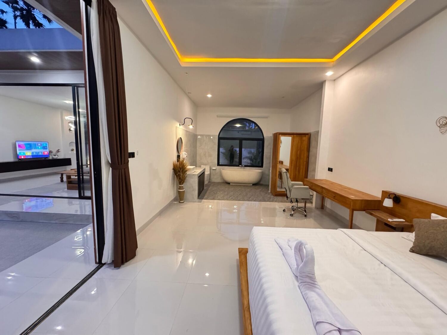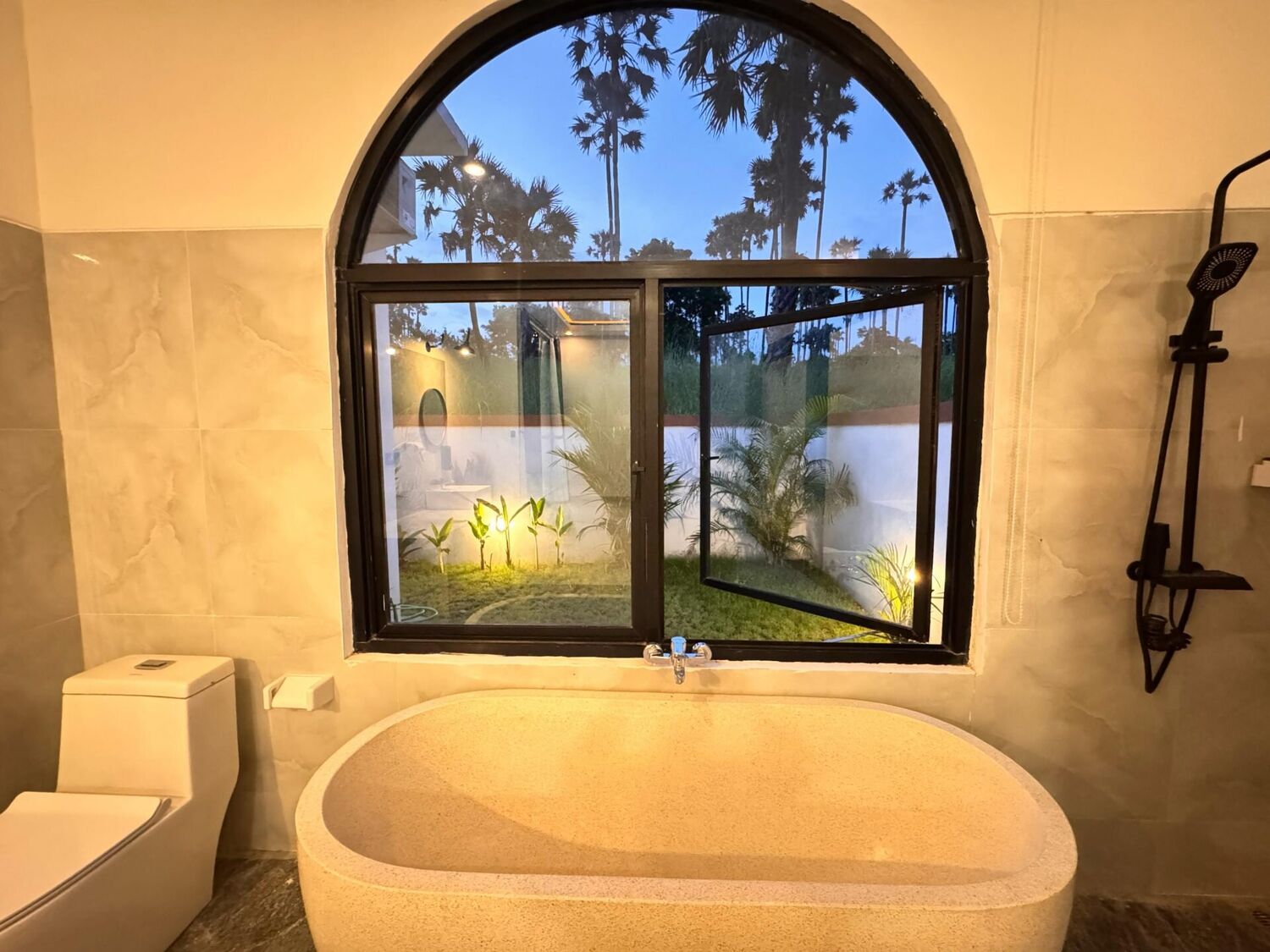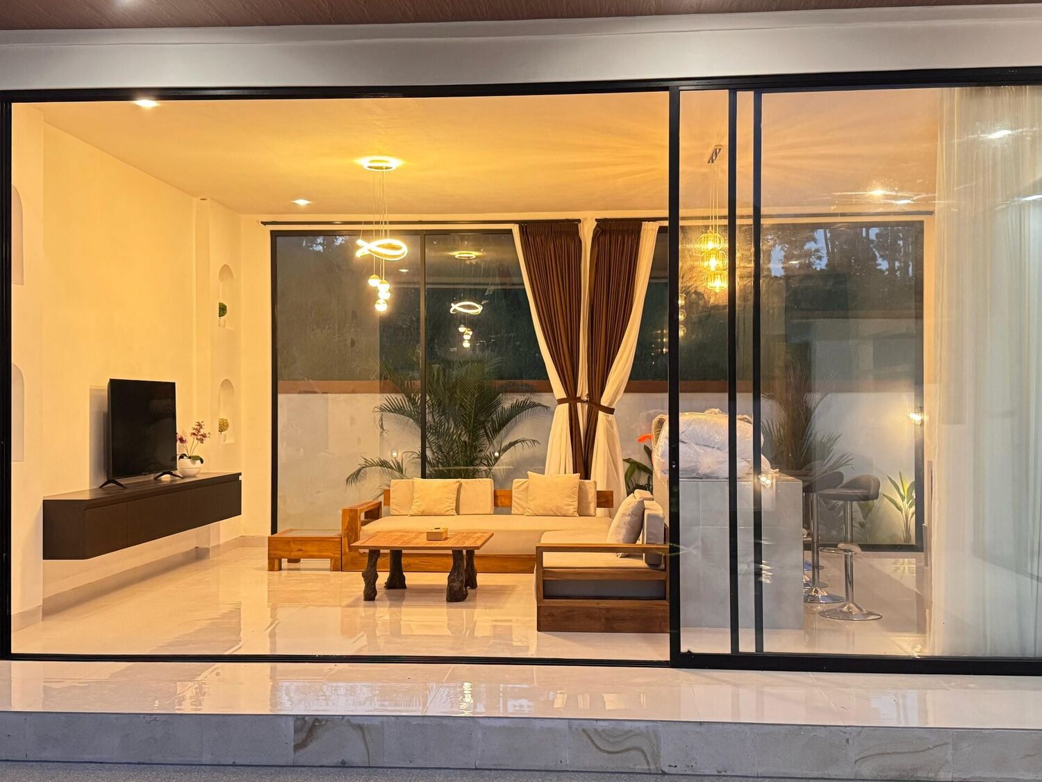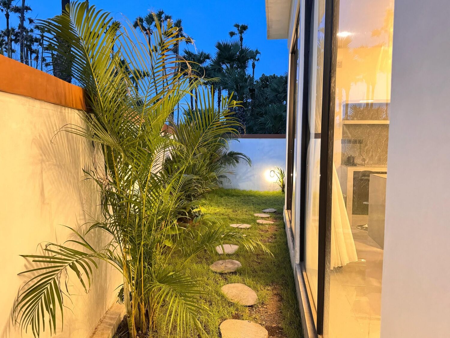 Set on a 300 sqm plot, the property features 160 sqm of stylish, enclosed living space designed for year-round comfort. The clean, minimalistic interiors are enhanced by natural light and feature a fully equipped kitchen, spacious living and dining area, and two large bedrooms—each with its own bathroom. Sliding glass doors open up to a well-manicured garden and a private swimming pool, ideal for relaxing afternoons in the tropical sun.
