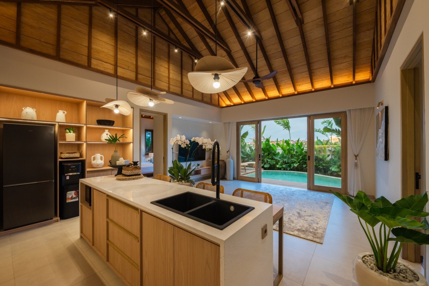 The home is surrounded by greenery, offering mini jungle views and a breezy, tranquil atmosphere from the terrace and poolside. The natural flow between indoor and outdoor spaces, combined with warm lighting, wooden textures, and open sightlines, creates a peaceful escape that still feels connected to the vibrant lifestyle of Canggu, just minutes away.